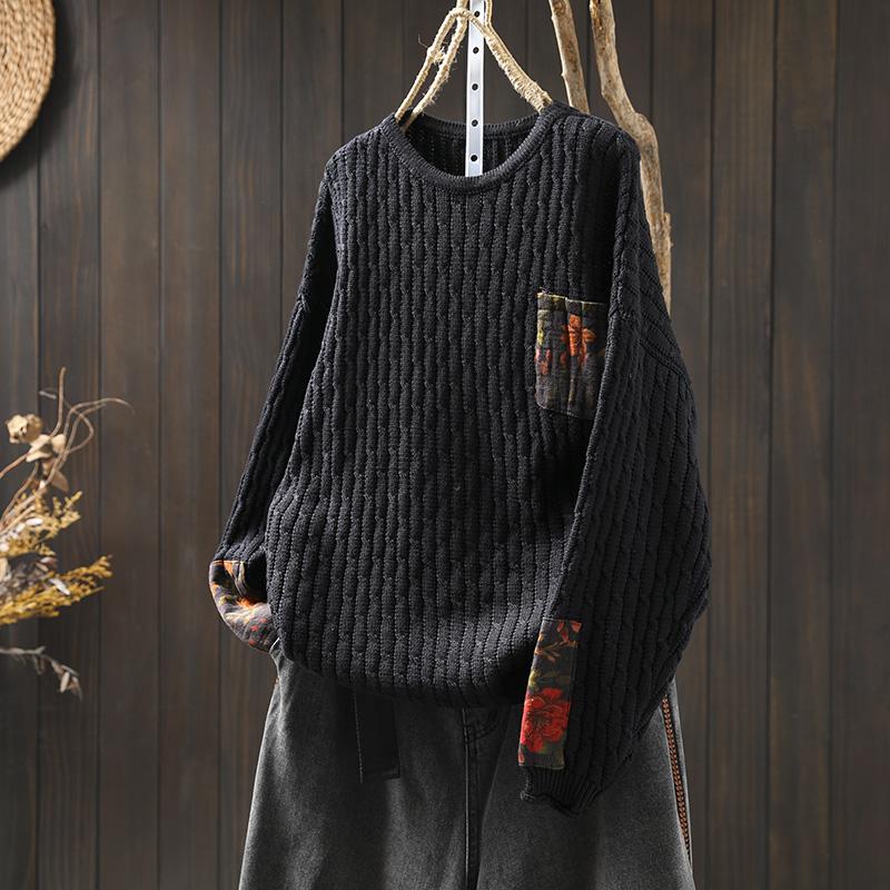 复古民族风贴布棉线毛衣女秋冬款大码宽松慵懒落肩圆领套头针织衫