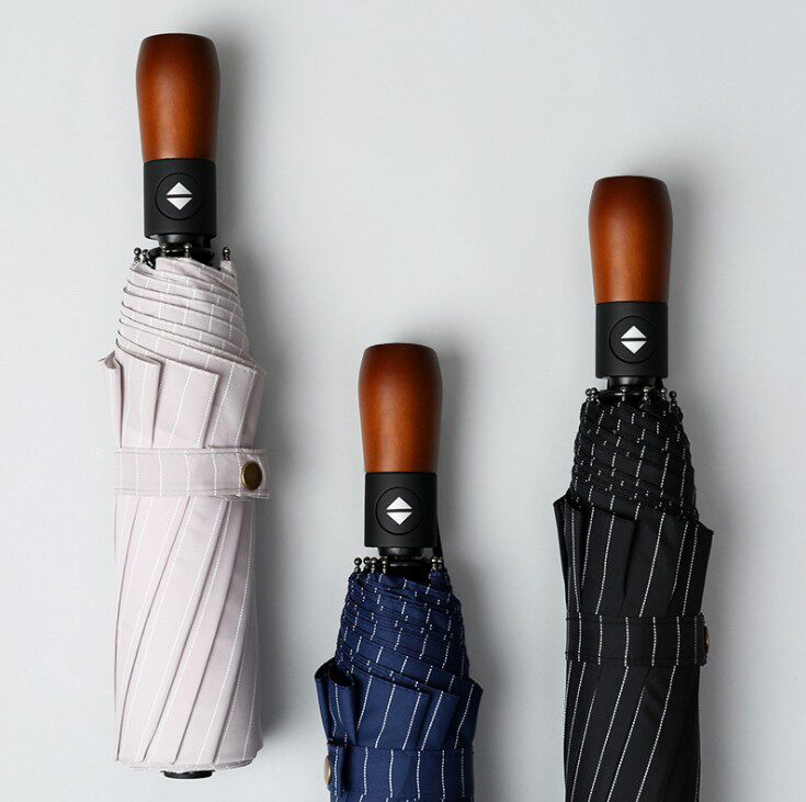 全自动实木手柄伞十骨防风雨伞三折两用晴雨伞 折叠伞男条纹商务