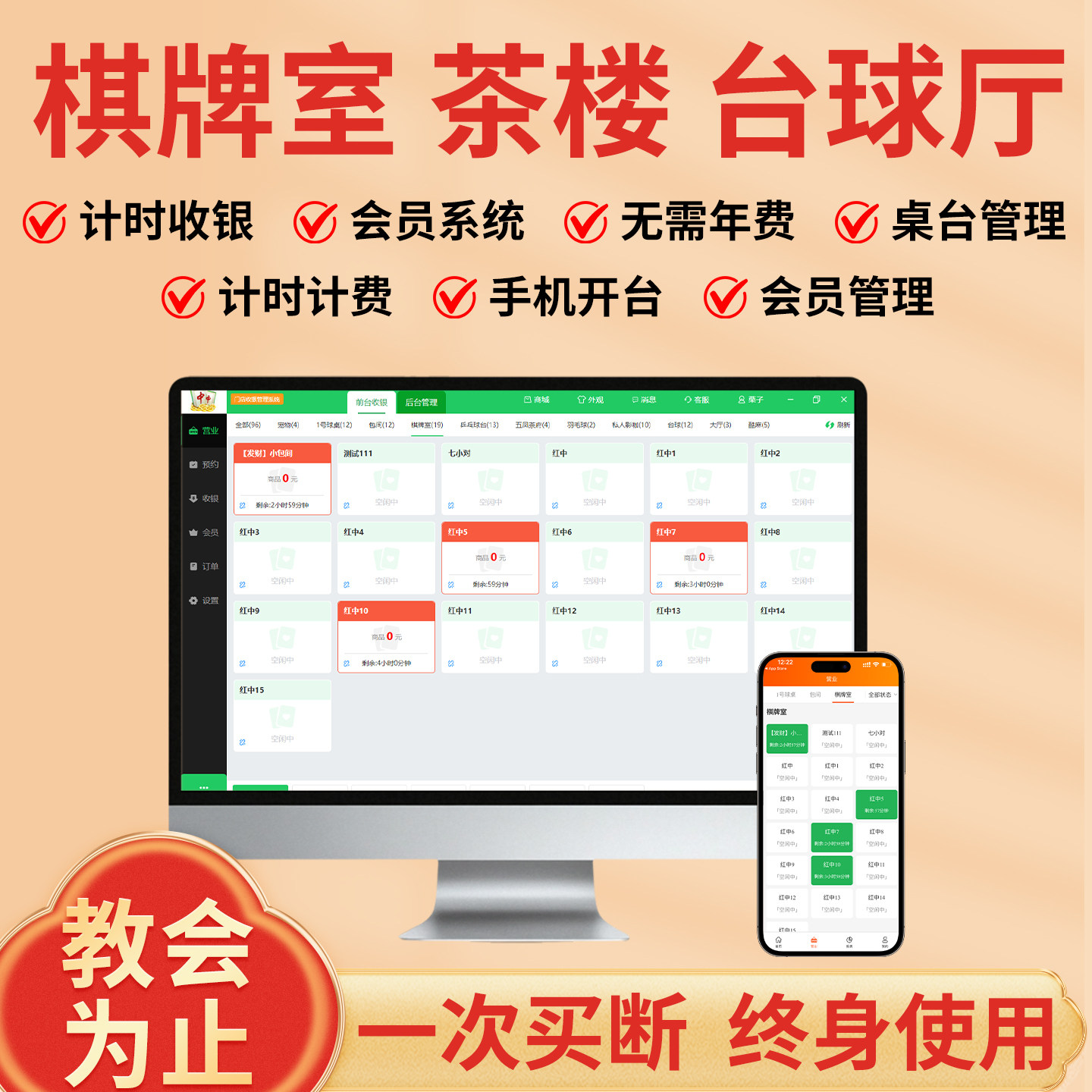 棋牌室收银管理系统麻将馆茶楼台球厅钓场电竞馆房台计时计费软件灯控电控管理系统会员卡储值消费积分一体机