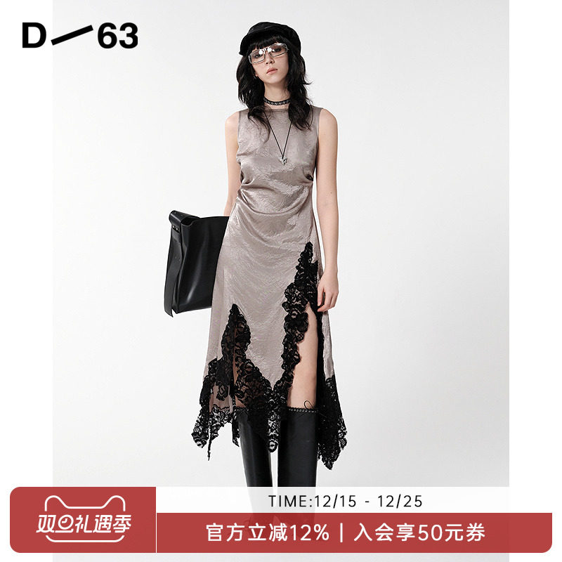 D63女装25秋季新款背心裙褶韵艺术无袖收腰连衣裙蕾丝点缀中裙