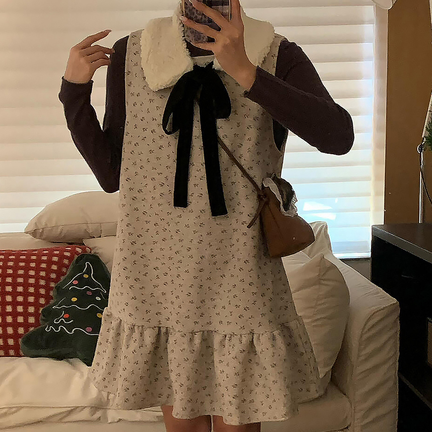 荷叶边碎花毛绒拼接连衣裙女秋冬2025新款宽松休闲甜美背心中裙潮