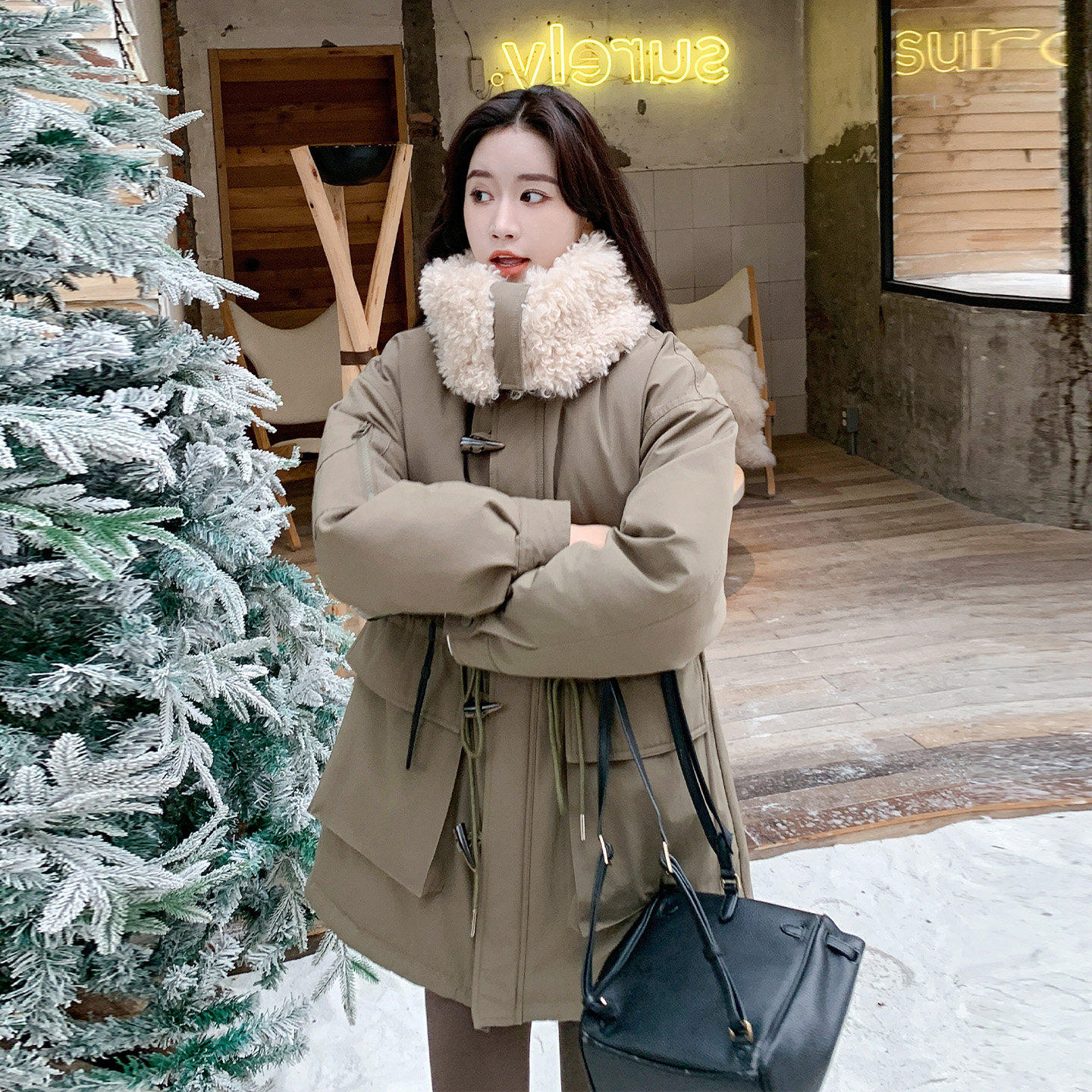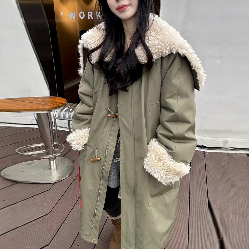 韩版羊羔毛大翻领牛角扣派克服外套女中长款加厚保暖休闲夹棉棉服