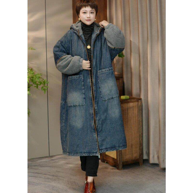 秋冬韩版宽松加厚连帽牛仔棉衣女棉服中长款棉袄加绒羊羔毛外套潮