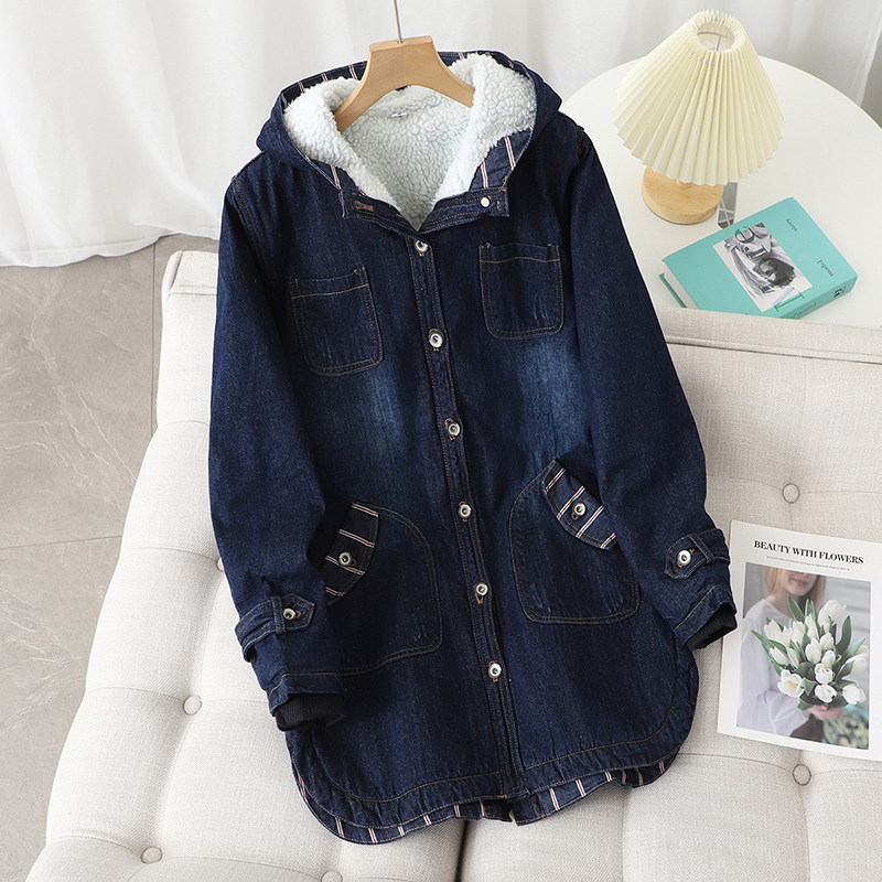 秋冬季羊羔毛牛仔外套女韩版中长款加绒加厚连帽棉衣宽松大码棉袄