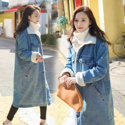 羊羔毛牛仔外套跨境冬韩版宽松大码翻领女中长款加绒加厚保暖棉衣
