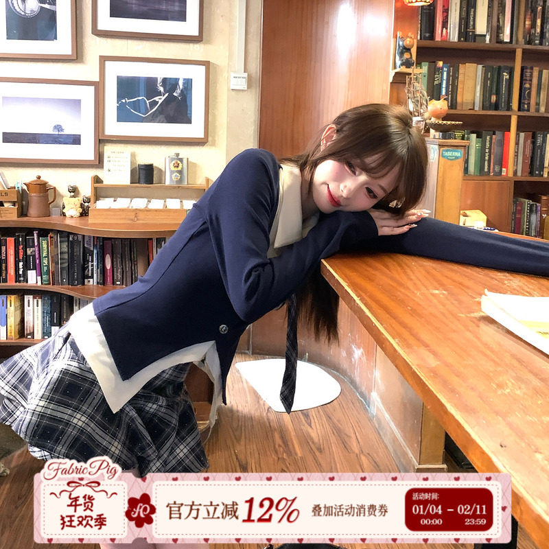 织物猪 薄荷汽水 韩系学院风短裙套装女秋jk制服假两件上衣两件套
