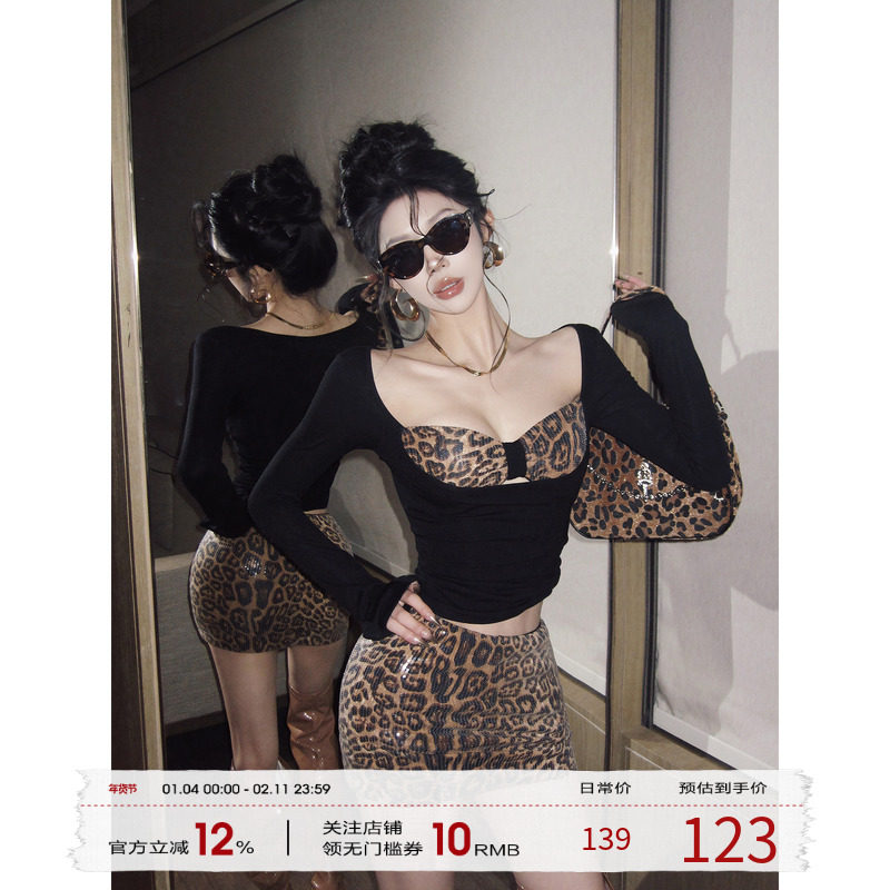 福尔尼斯悦 辣妹套装女2025冬季新款豹纹拼接抹胸上衣短裙两件套