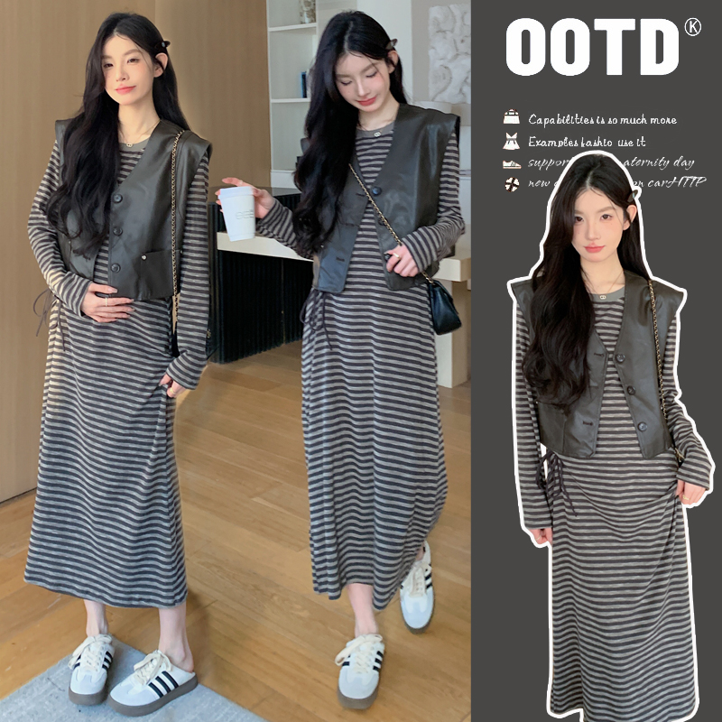 孕妇装秋装长袖条纹连衣裙秋季PU皮马甲两件套连衣裙孕妇套装裙子