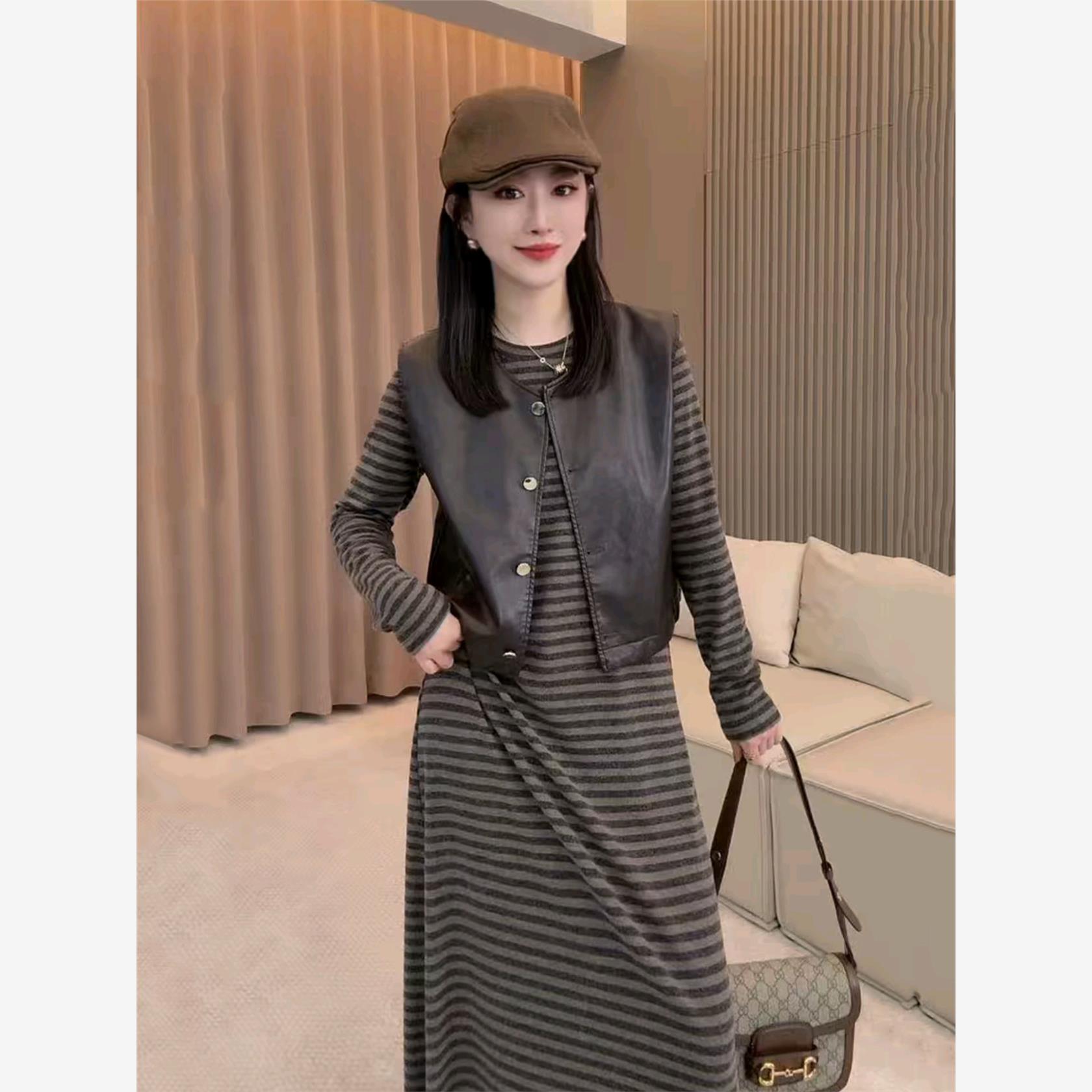 欧货2025秋季新款时尚纽扣蛋白皮马甲+休闲条纹长袖连衣裙两件套