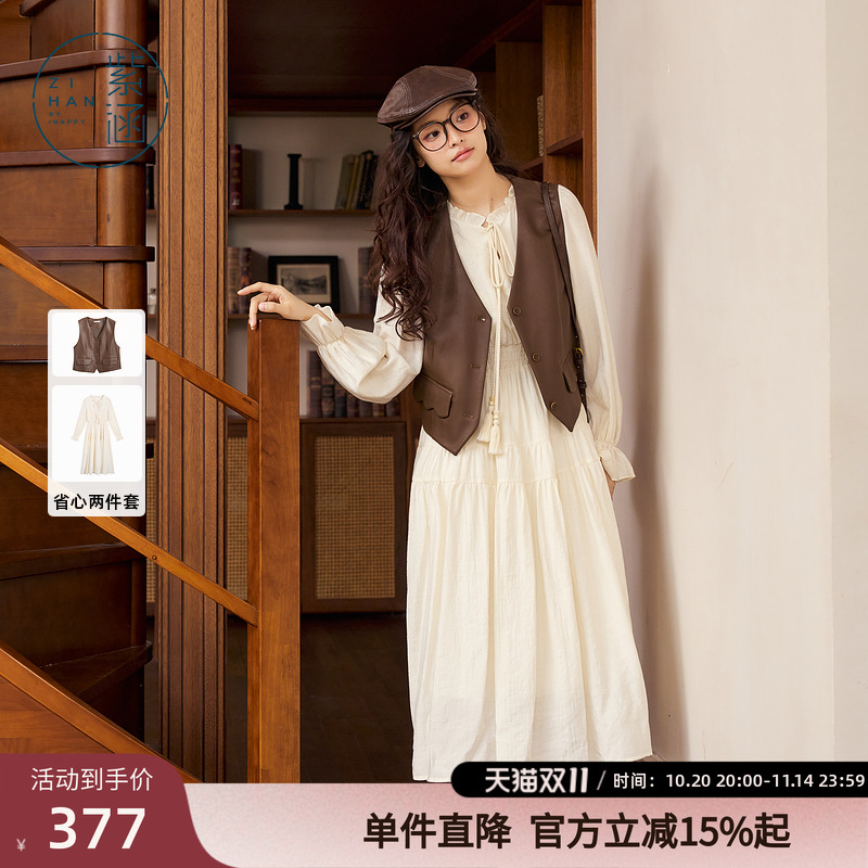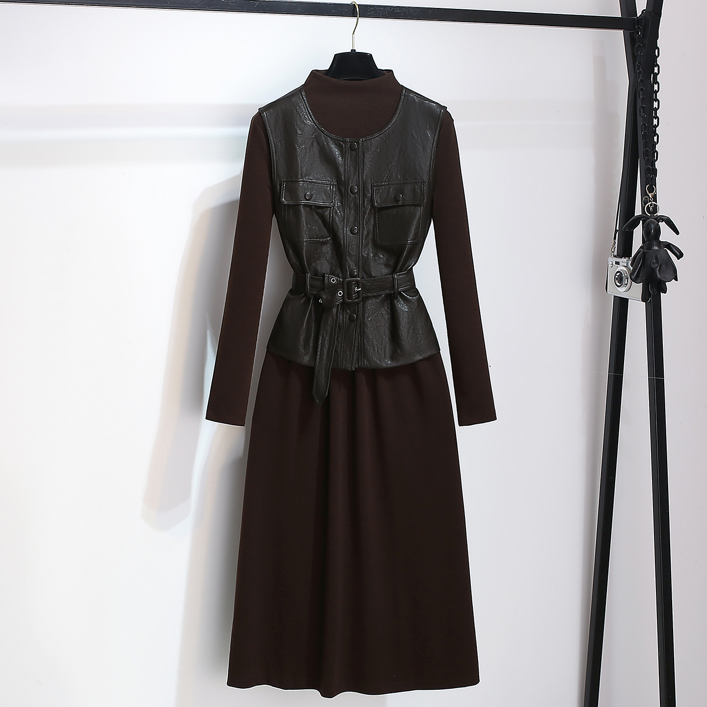 【佐】 无扣皮马甲+长袖裙子两件套连衣裙871~冬季新款女装