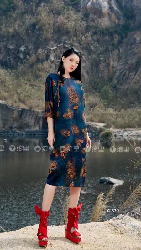 皮子高货连衣裙!50姆米缎面提花中式长袍子长袖绮里qllyq-清