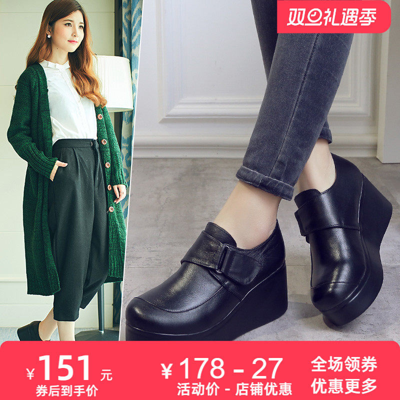 红蜻蜓女鞋春秋新款厚底高跟坡跟女士休闲皮鞋女单鞋真皮妈妈牛皮