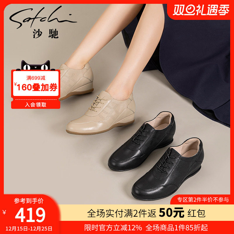 沙驰女鞋新款时尚坡跟透气休闲鞋春秋新款复古单鞋乐福鞋女小皮鞋