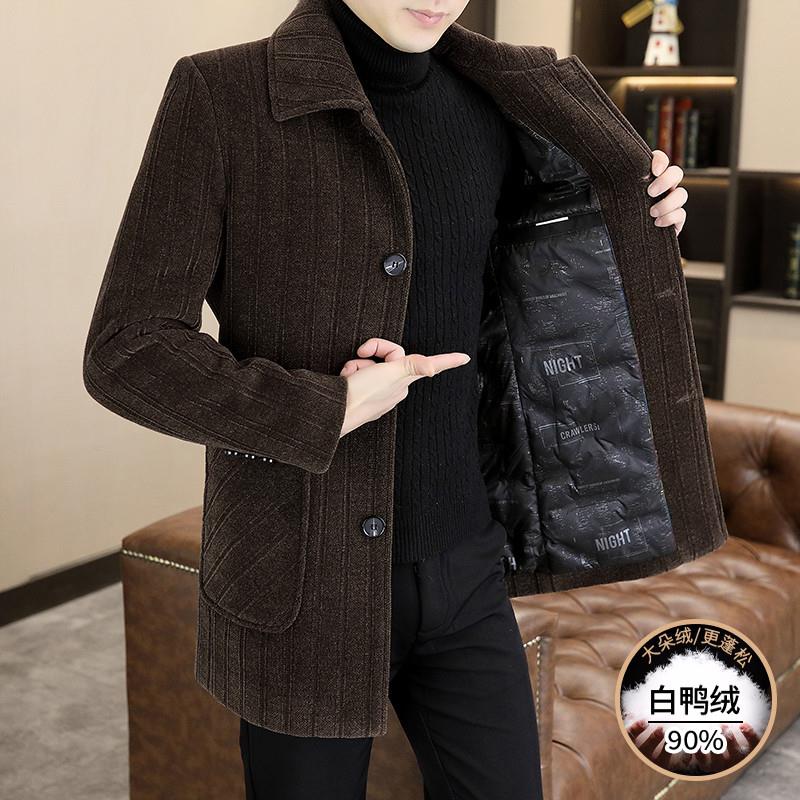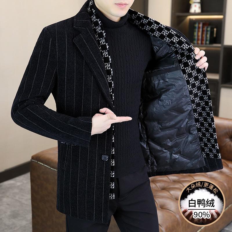 冬季毛呢大衣男中长款加厚条纹西装领风衣休闲男装保暖羽绒服外套