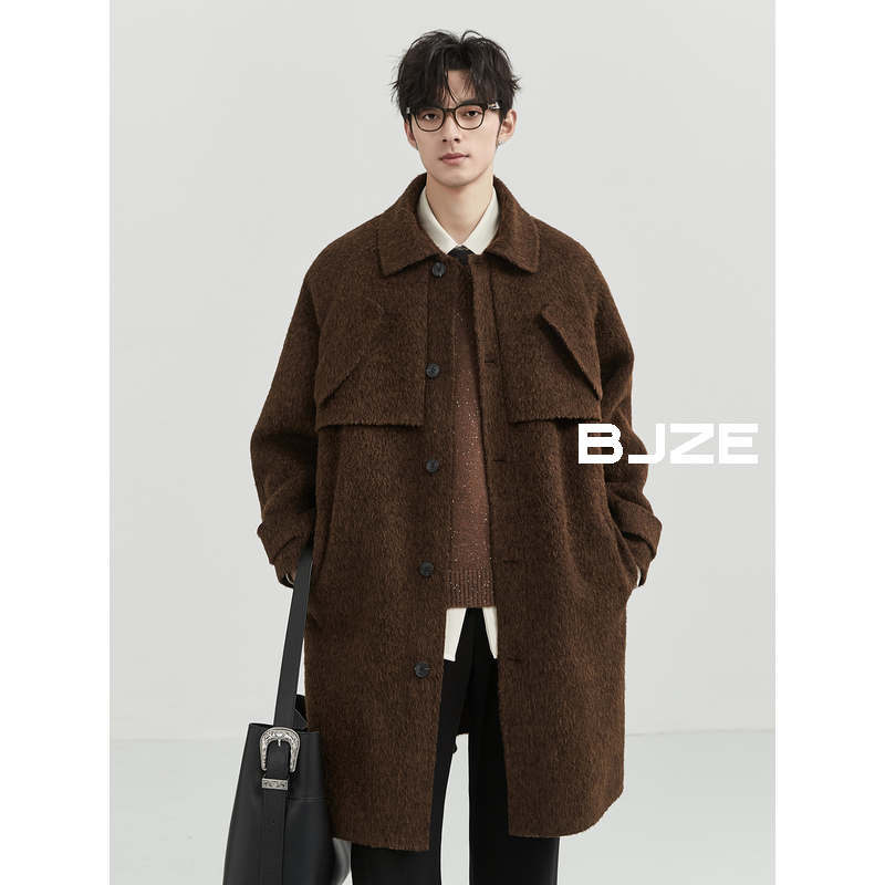 BJZE男装24冬季牦牛毛双面羊毛呢大衣男中长款加厚宽松西装领外套
