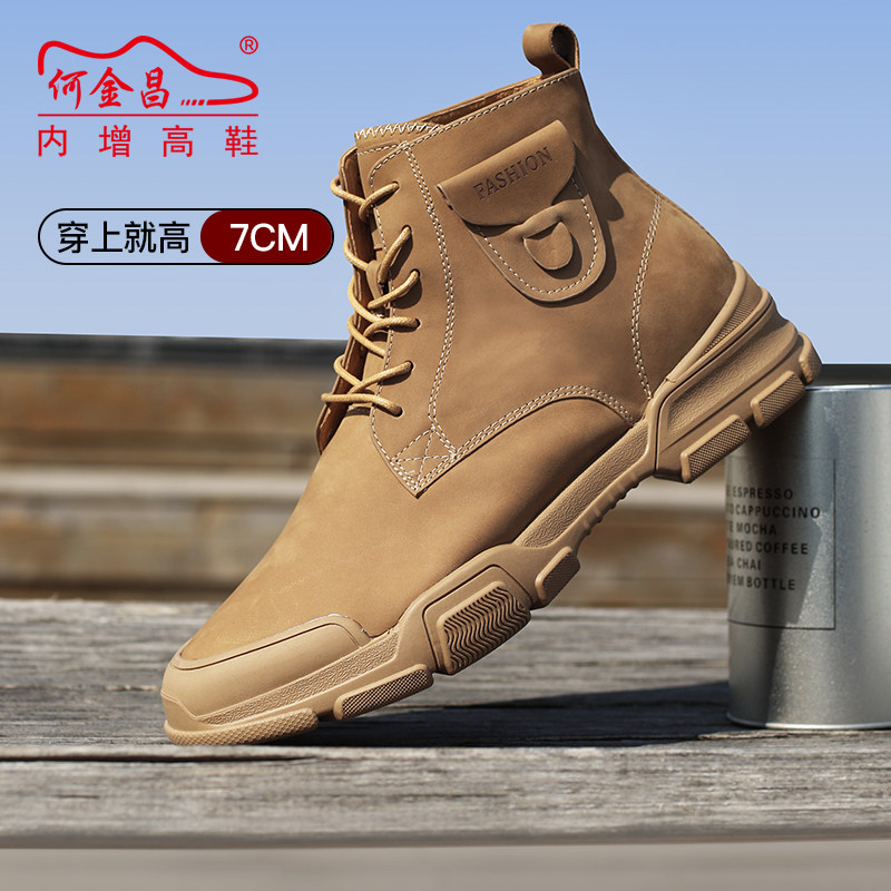 何金昌内增高马丁靴7cm短靴真皮靴子工装靴男士内增高中高帮男靴
