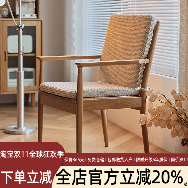 北欧实木橡木带扶手椅子日式布艺靠背软包餐椅简约书桌咖啡休闲椅