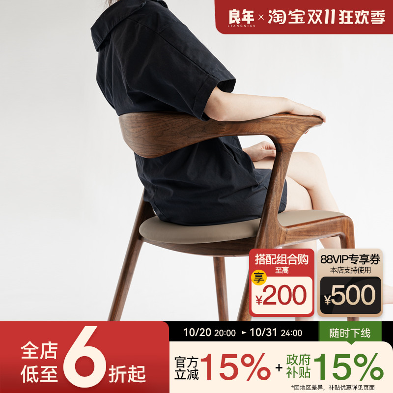 良年 蜜思餐椅实木椅子靠背带扶手北欧牛皮黑胡桃木现代茶椅家用
