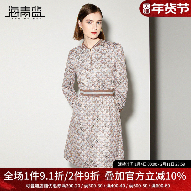 海青蓝设计感印花连衣裙女2025新款春装大气收腰显瘦休闲中长裙