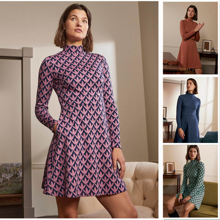 英国单BD 高领提花连衣裙卫衣裙长袖女立体裁剪有大码休闲春装