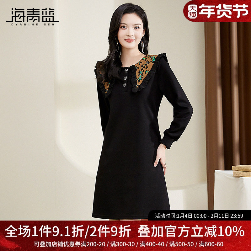 海青蓝减龄翻领洋气显瘦连衣裙2025春装新款黑色遮肚子休闲卫衣裙