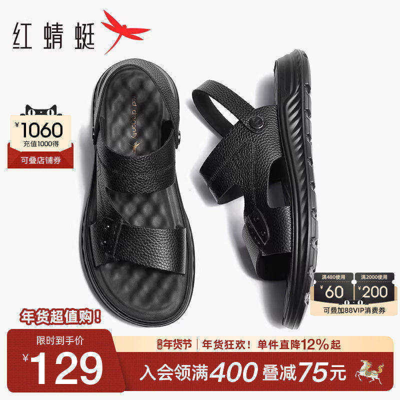 红蜻蜓凉鞋男夏季新款牛皮休闲沙滩鞋男士真皮厚底爸爸拖鞋男防滑