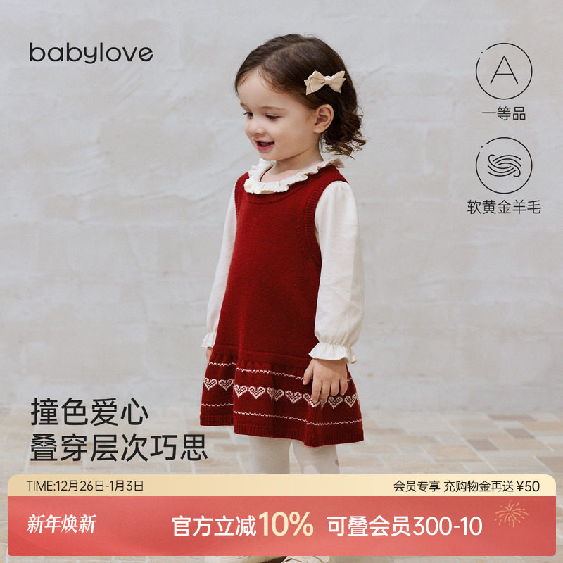 babylove女宝宝连衣裙秋冬羊毛针织拜年服洋气圣诞裙子星空锈红