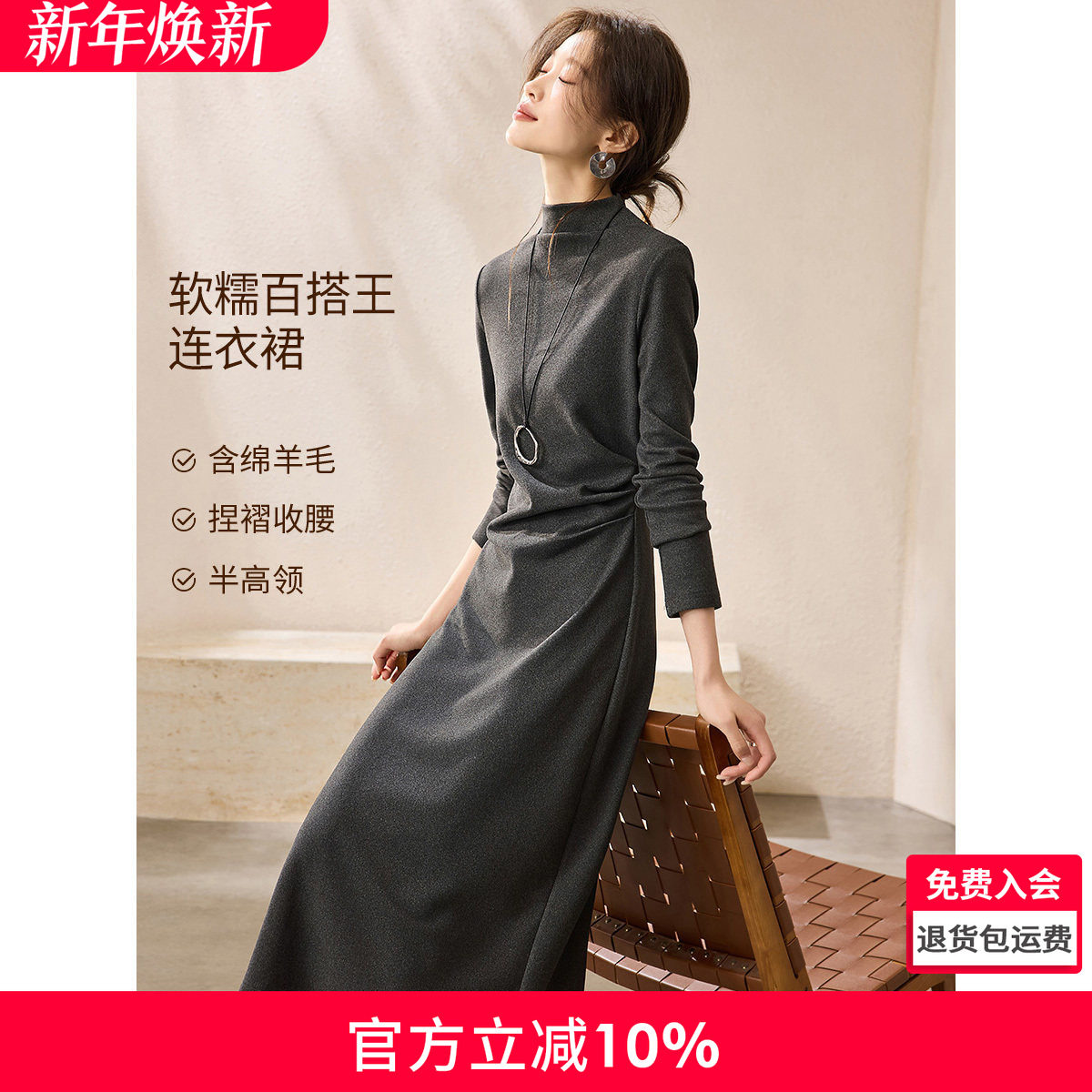 POET WONG【娇美姐姐】垂又暖!含羊毛大圆领收腰连衣裙内搭伴侣冬
