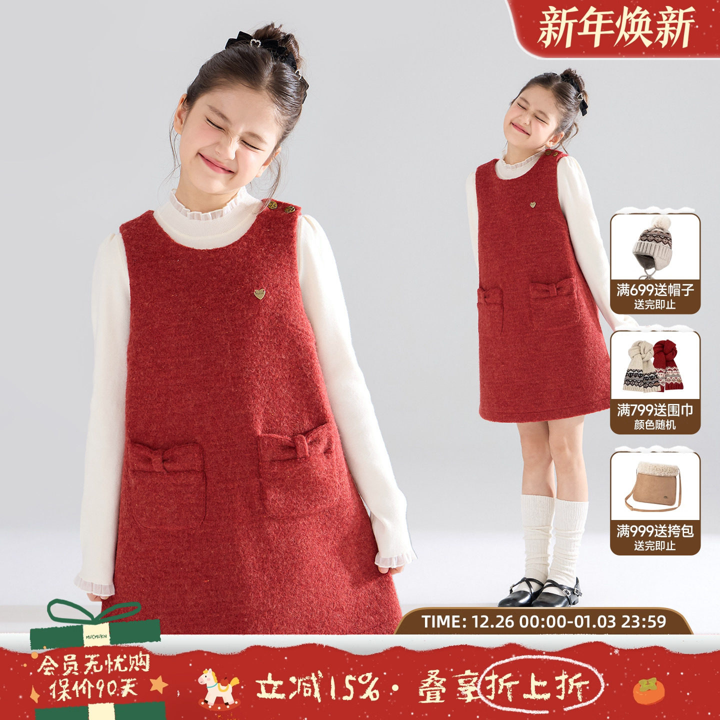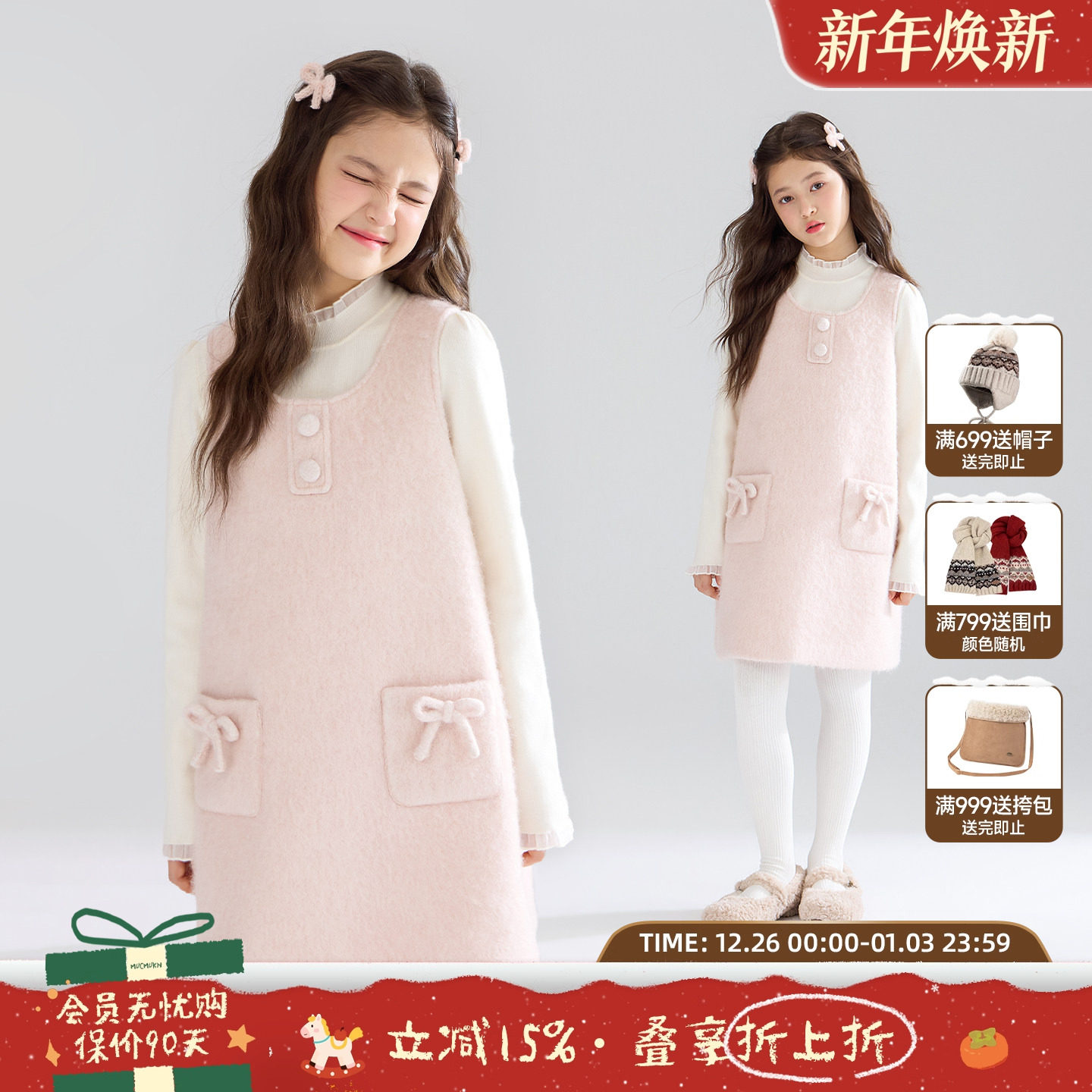 MUCMUKN【粉雪茸茸】蝴蝶结亮丝羊毛呢连衣裙新年圣诞女童25冬新
