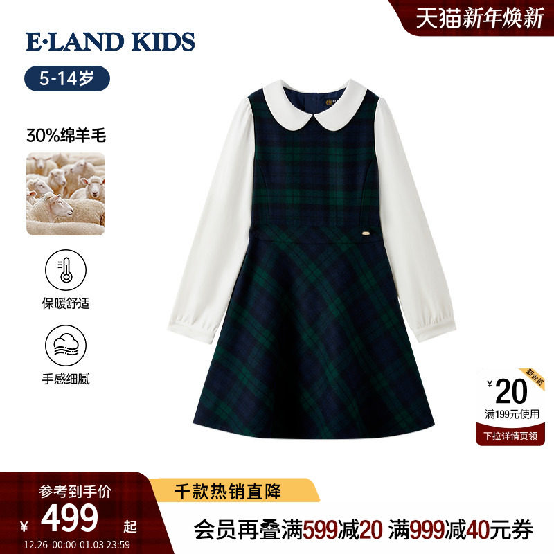 【30%绵羊毛】eland kids衣恋童装女童连衣裙2025冬新品格纹裙子