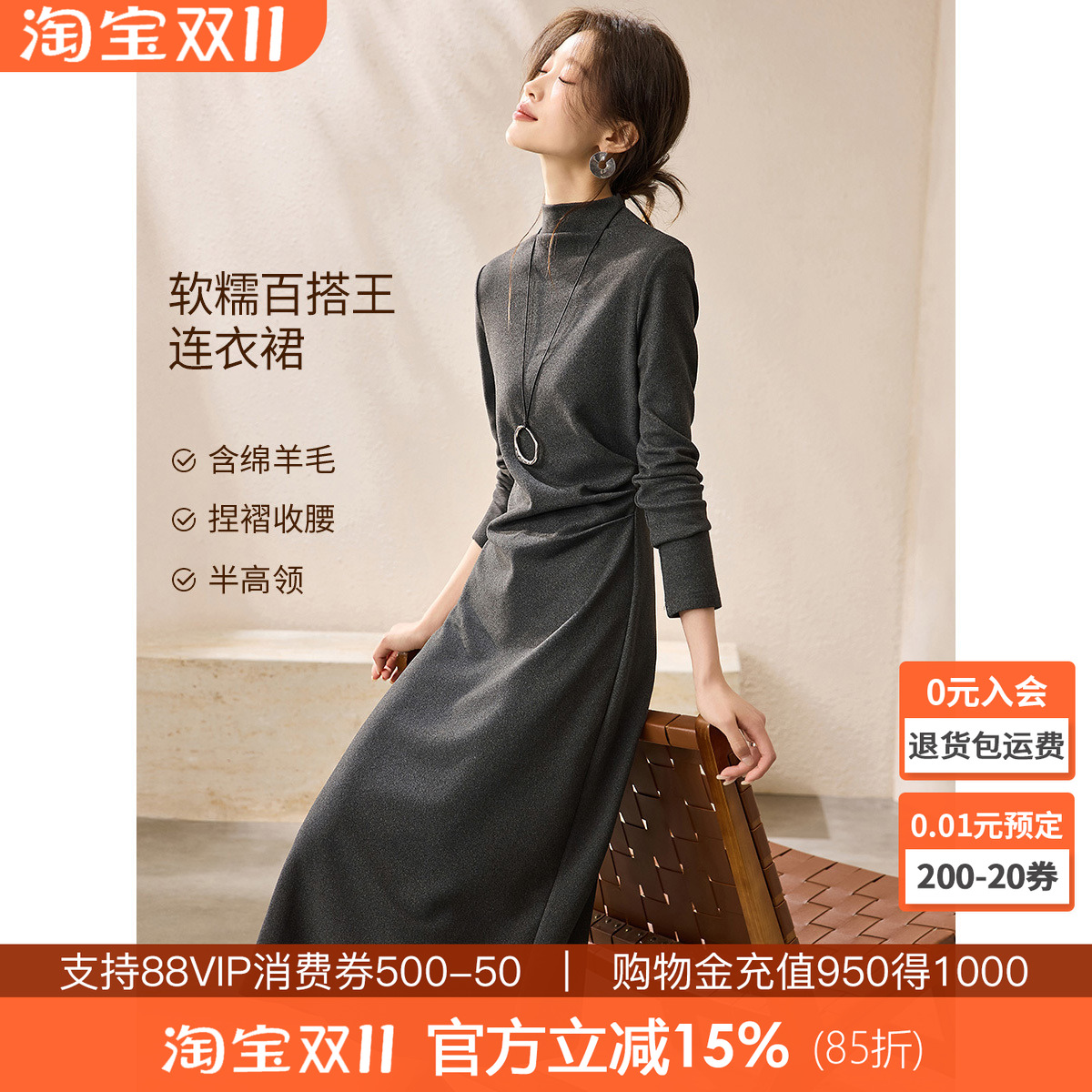 沫晗依美含羊毛软糯百搭裙子2025冬季捏褶收腰优雅中长裙连衣裙女
