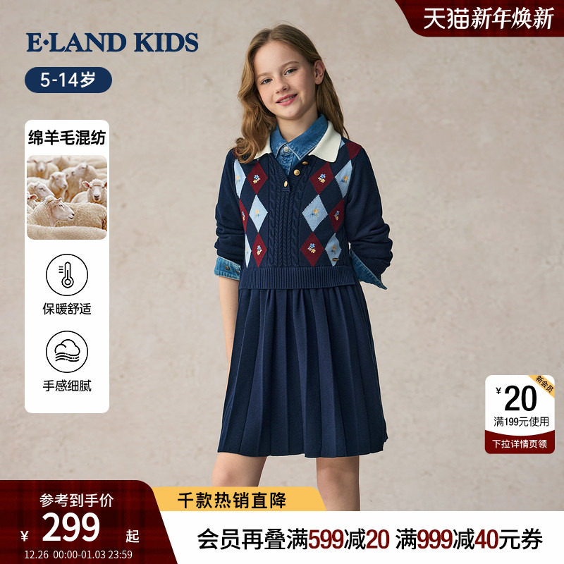 eland kids衣恋童装女童连衣裙2025年冬季新羊毛混纺针织百褶裙