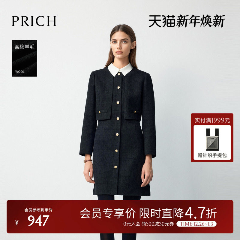 PRICH时尚绵羊毛小香风撞色翻领假两件连衣裙2025冬季新款裙子女