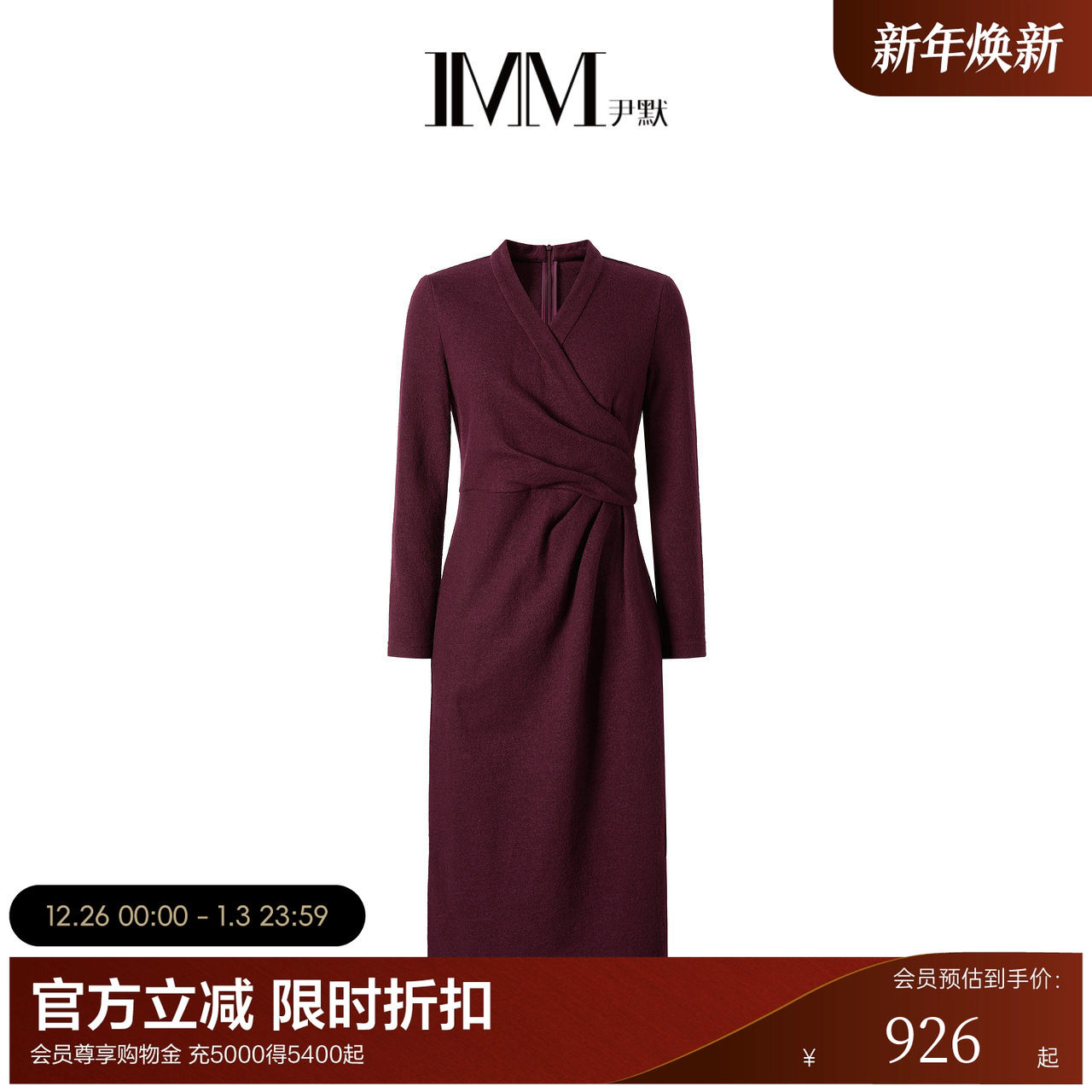 IMM尹默女装秋冬美利奴羊毛安可拉红收腰连衣裙扭结捏褶气质长裙