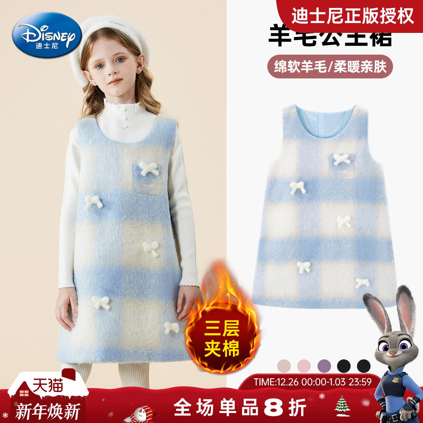 迪士尼女童冬季连衣裙小女孩蝴蝶结背心裙舞台礼服保暖羊毛公主裙