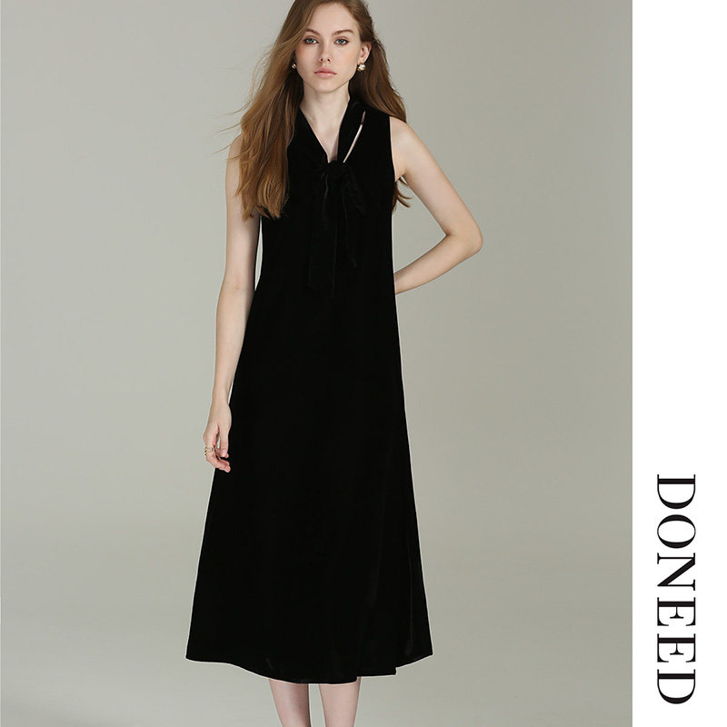 DONEED2025春新款时尚法式飘带V领纯色设计浪漫丝绒长款连衣裙女