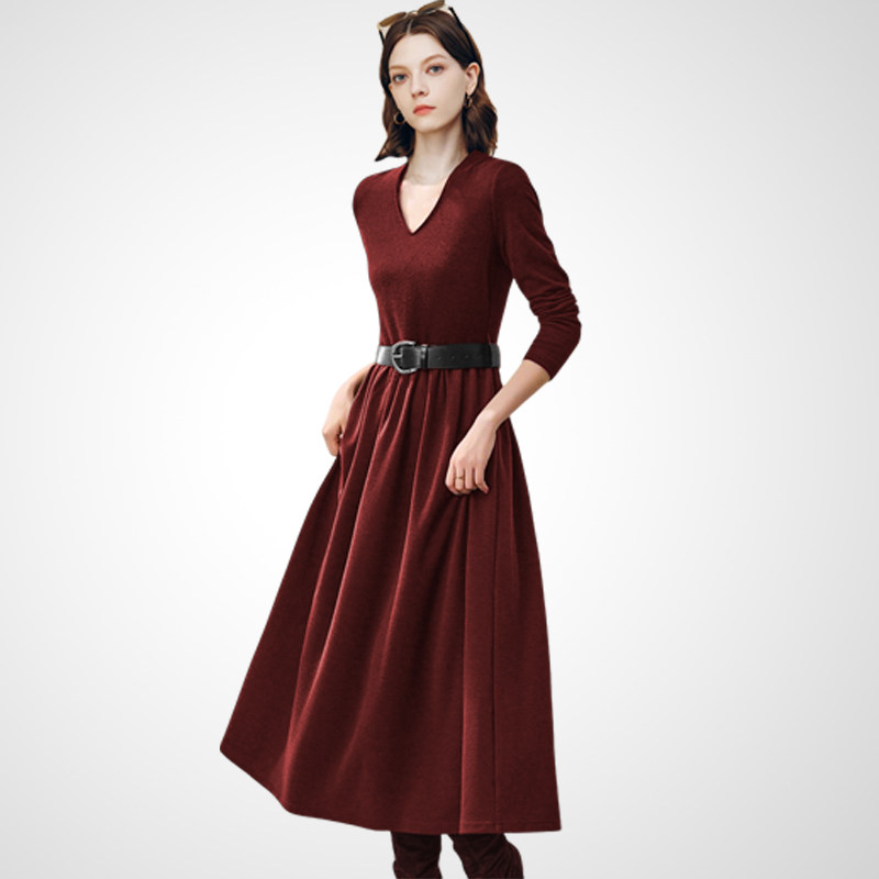 兰卡时尚酒红色丝绒长款连衣裙女2025秋冬款V领收腰长款通勤长裙