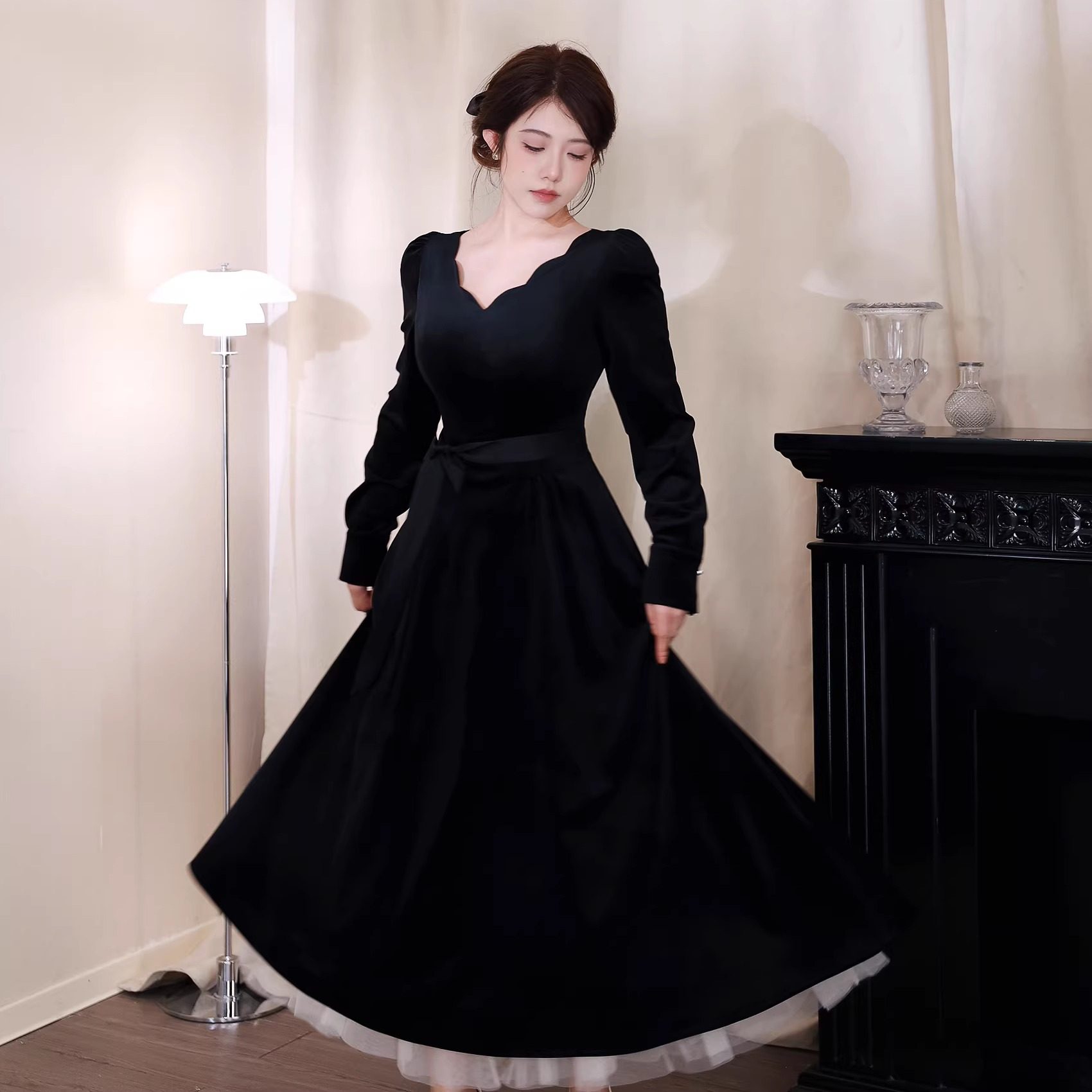 黑色丝绒连衣裙女2026年春季新款法式赫本风收腰中长款包臀裙子