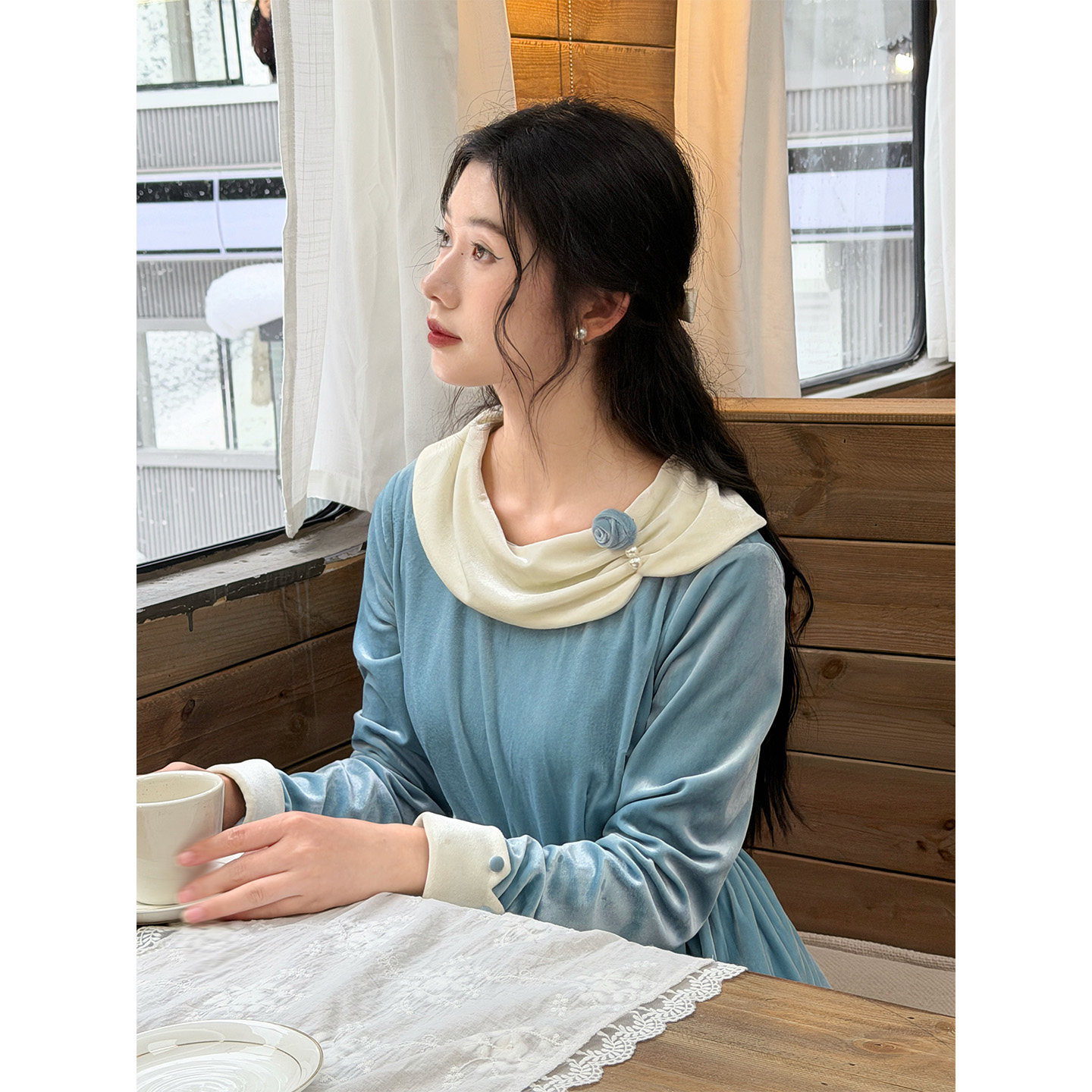le rouge周美美 彼得潘氧气少女娃娃领褶皱灯笼袖丝绒长款连衣裙