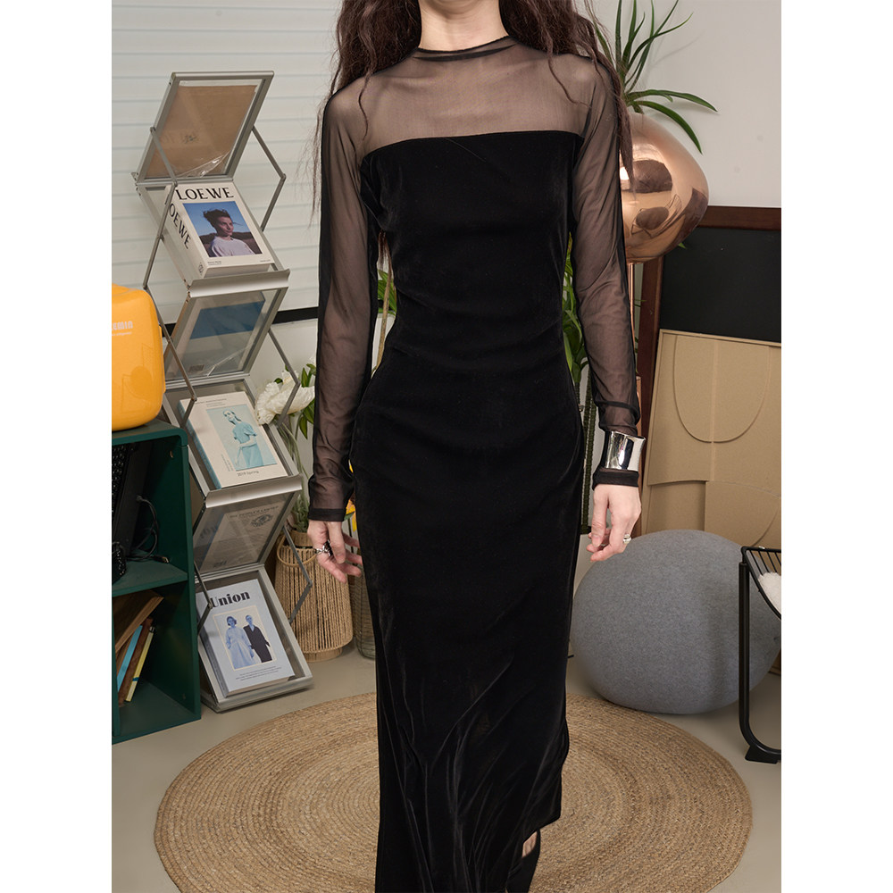 品诺狐2025秋冬气质通勤黑色金丝绒长款连衣裙高腰遮肚显瘦包臀裙
