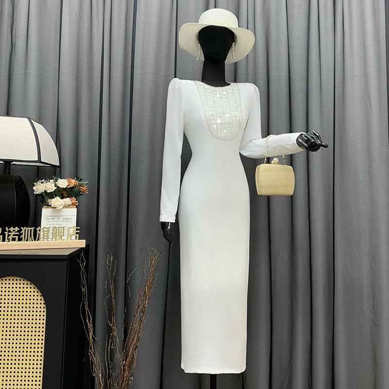品诺狐重工订珠亮片金丝绒长款连衣裙秋冬新品高腰白色简约包臀裙