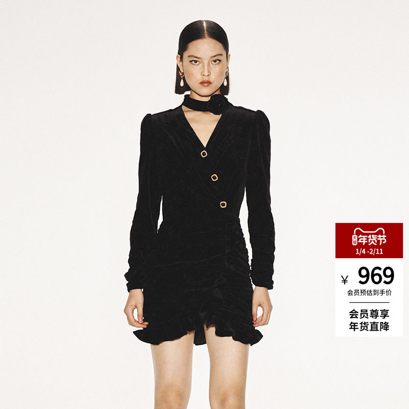 又见封神连衣裙!年末显瘦小优雅 原创设计V领假两件长款丝绒裙