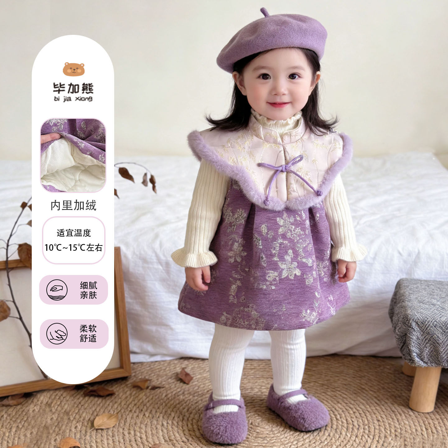 婴儿衣服女童秋冬夹棉连衣裙洋气周岁礼服背带套装裙两件装公主裙