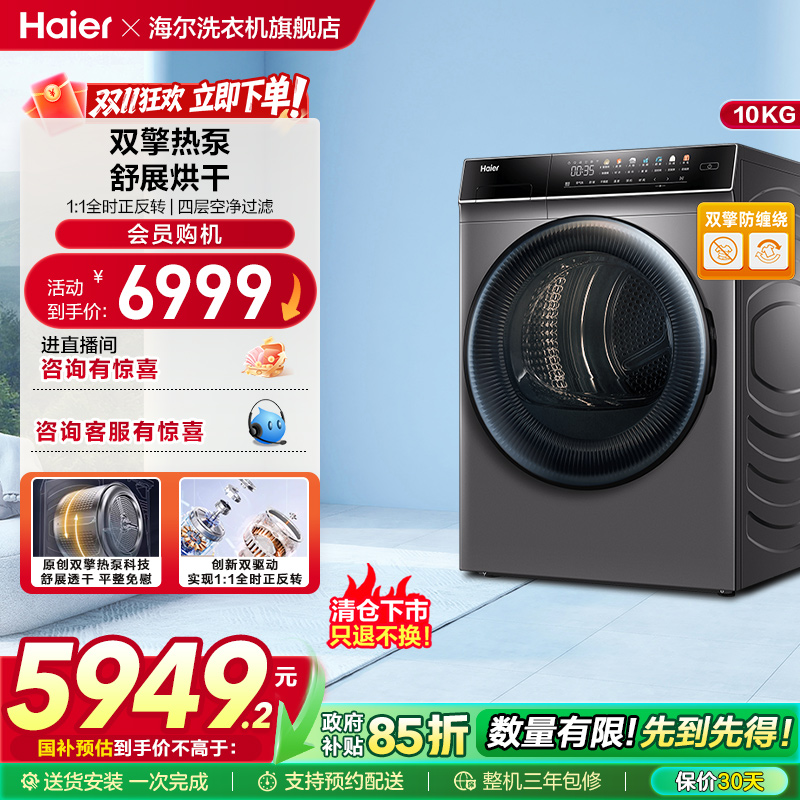 【海尔双擎】热泵烘干机10kg全自动家用滚筒干衣机防缠绕MATE7S