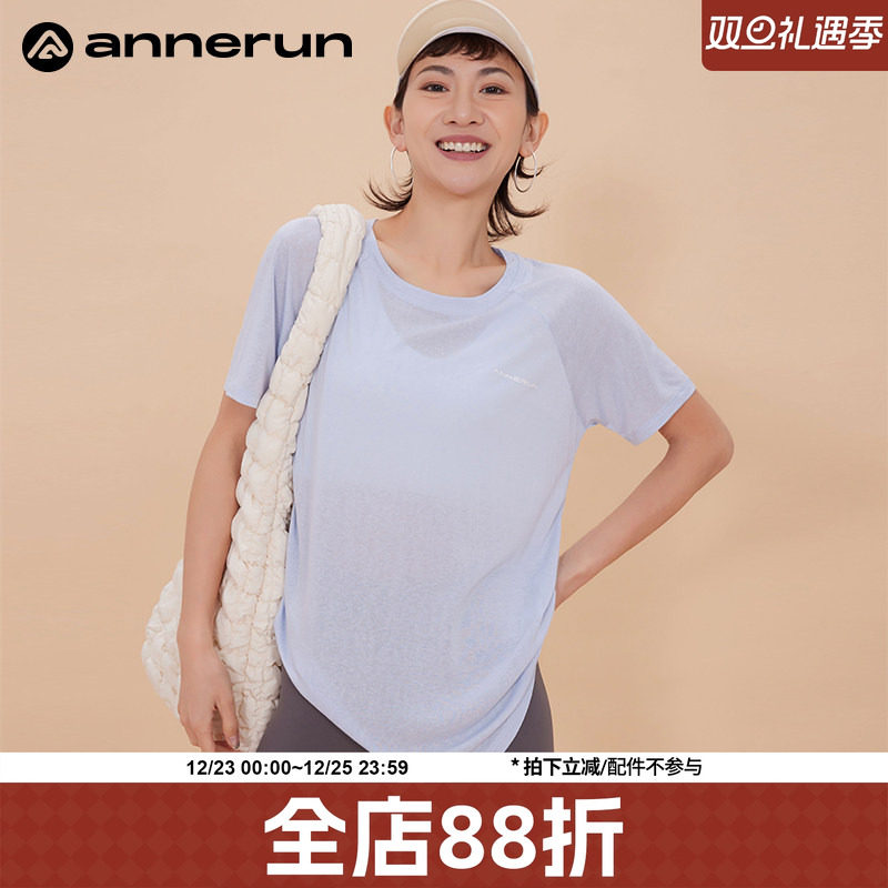 annerunV领宽松运动上衣女透气短袖T恤瑜伽服跑步速干衣健身罩衫