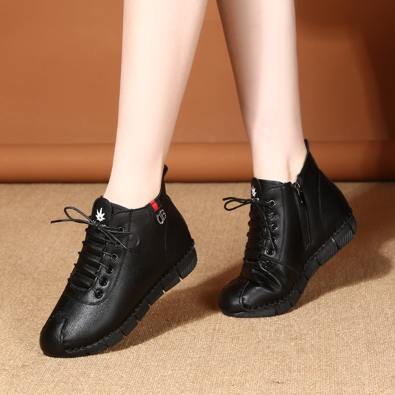 真皮平底短靴女2025春季新款防滑软底系带圆头百搭舒适马丁靴棉鞋