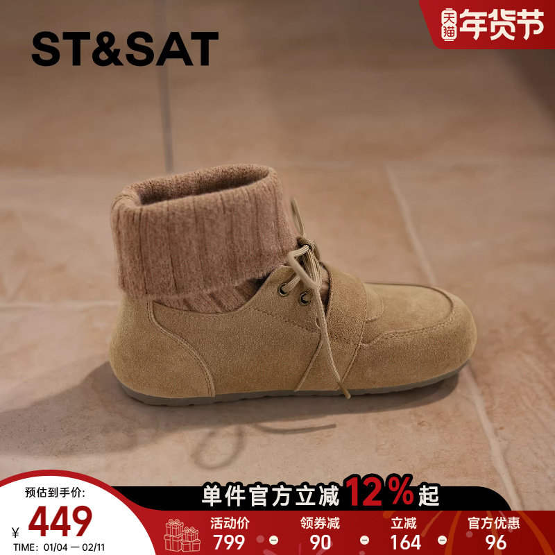 星期六圆头弹力靴女2025秋冬新款系带套筒休闲外穿平底勃肯鞋短靴