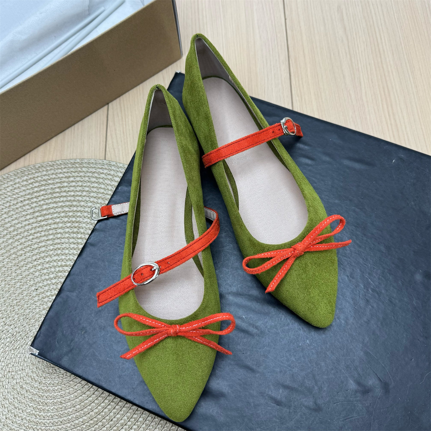 法式绿色绒面浅口尖头玛丽珍鞋女单鞋一字带蝴蝶结拼色平底芭蕾鞋