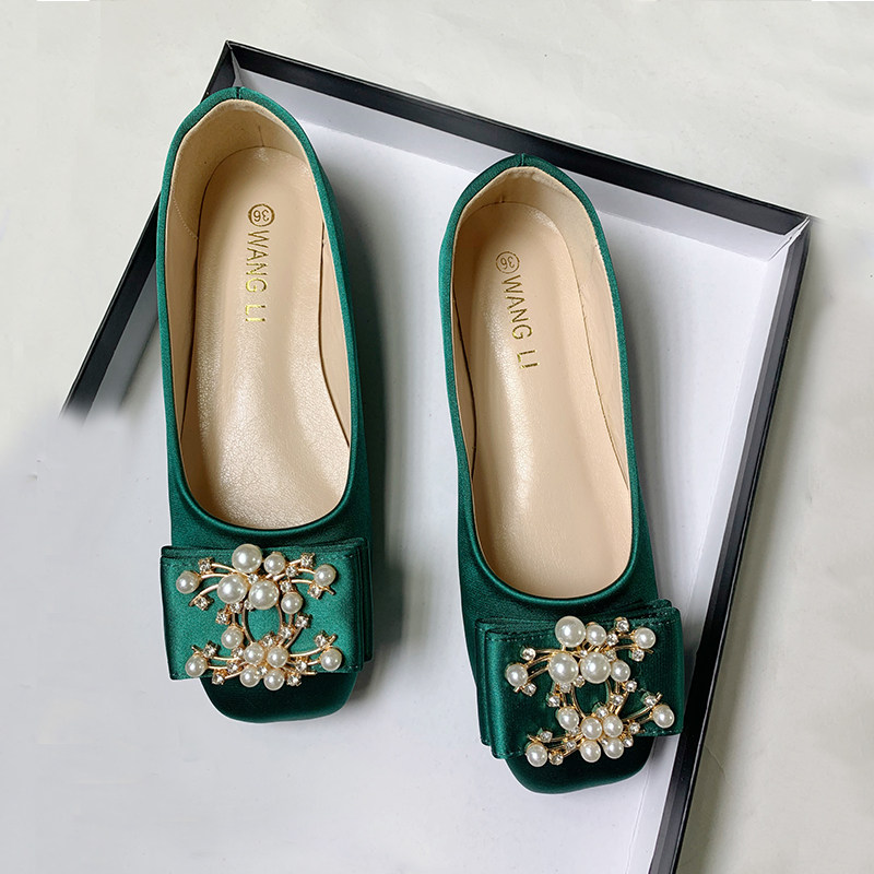 绿色婚鞋女结婚新娘上车鞋2021新款大码女鞋浅口方头软底平底单鞋
