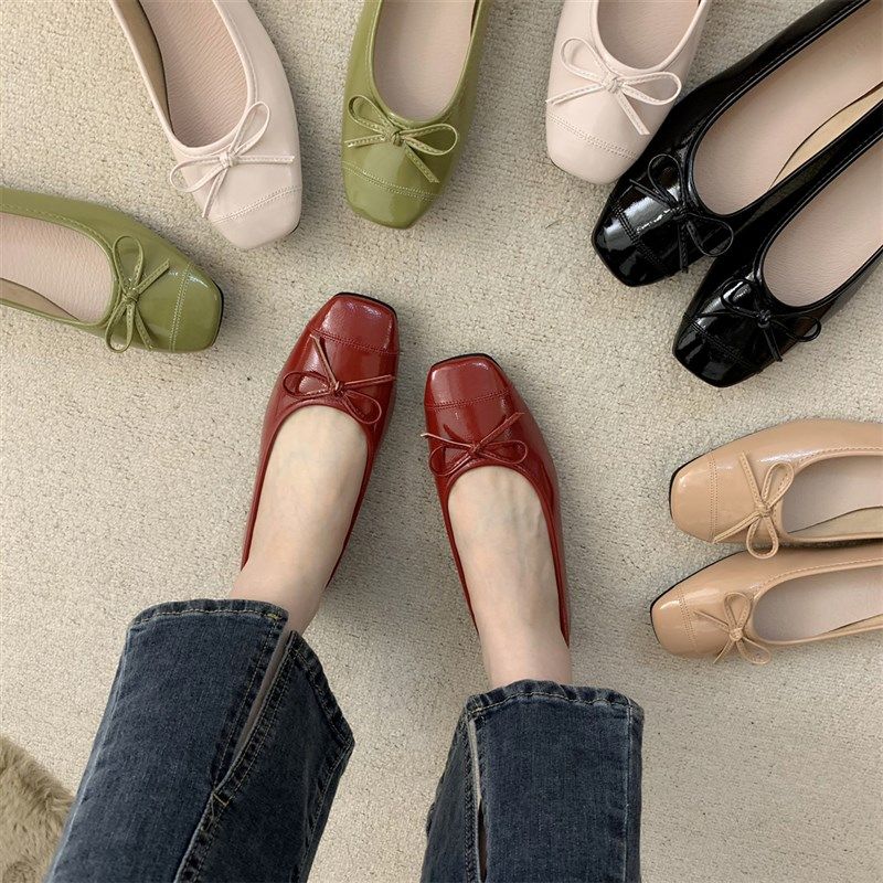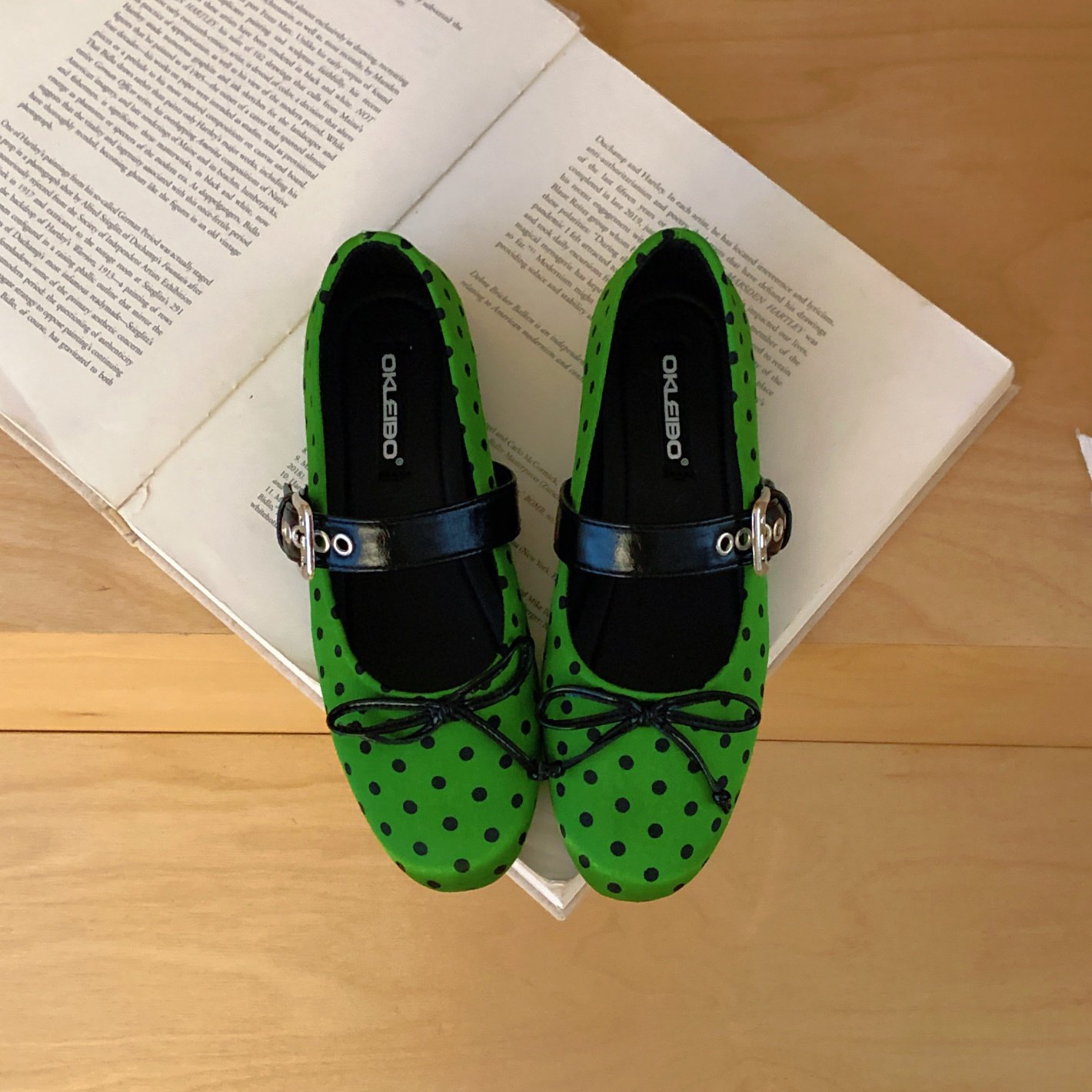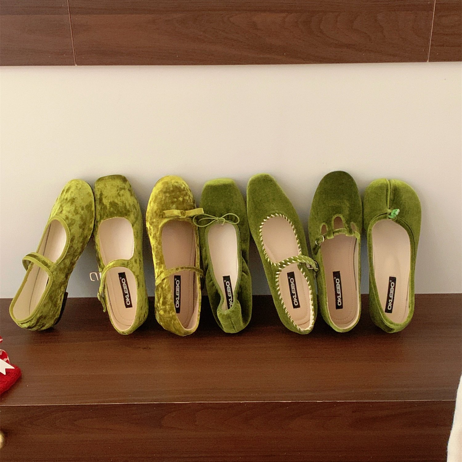 2025春夏新款芭蕾舞平底鞋女复古蝴蝶结浅口单鞋平跟绿色圆头软鞋